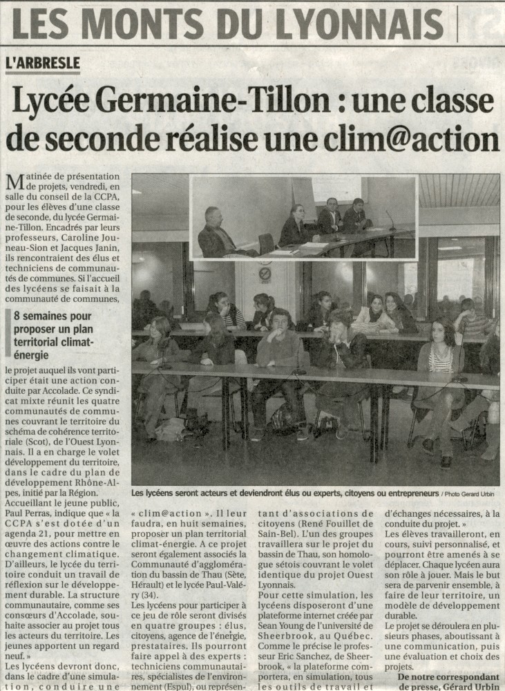 - Clim@ction, mise en place d'un Plan Climat Energie Territorial - Jeu retenu pour les Journées de l'Innovation 2012 (Unesco Paris mars 2012), ainsi que pour le Forum des enseignants innovants et de l'innovation éducative (Orléans juin 2012).